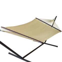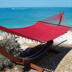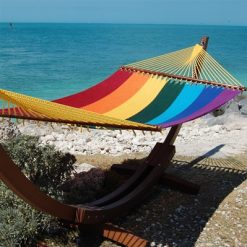 Nicaraguan Style Hammocks are a different take on the traditional American Rope Hammock. It has the classic American spreader hammock bar design but replaced the thicker ropes with ultra comfortable soft-spun rot-resistant polyester, woven into a tight knit micro weave. The result, all the looks and style of an American spreader bar hammock but with an improvement in comfort. The wood spreader bar has multiple coats of marine varnish to protect it from the elements and is a full 55 inches wide giving ample room for any sized couple. This hammock has a 7 ft. bed and hangs easily from two suspension points that are 13ft or more apart. Available in mocha (shown), tan, cream, green, yellow, orange, multi colored, red, purple and light blue. CLICK ON PICTURE FOR COLOR OPTIONS